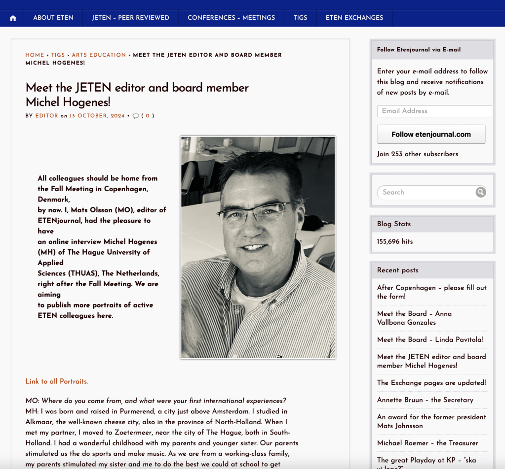 Media Internationalisation THUAS Lucia Marthas Institute for Performing Arts Olomouc Nuffic: Zo geef je internationalisatie at home een plek in de lerarenopleiding. See for the interview: https://etenjournal.com/2024/10/13/meet-the-jeten-editor-and-board-member-michel-hogenes/